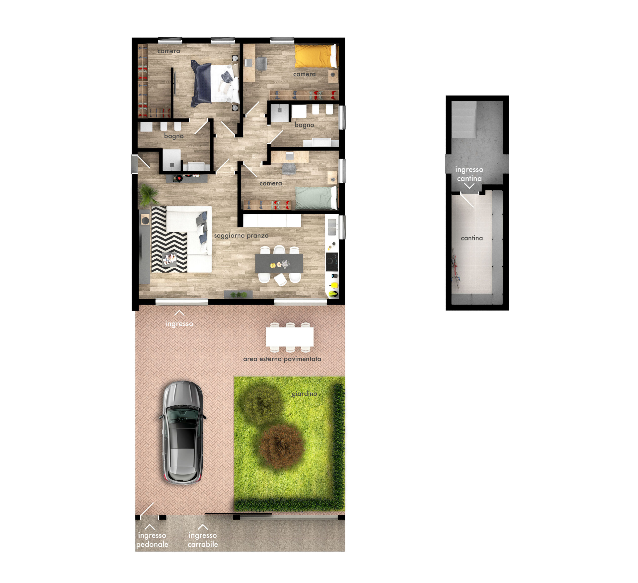 L’immobile dispone di camera padronale con bagno e cabina armadio, due camere da letto singole, bagno principale, un salone spazioso, una cucina open space che affaccia sul giardino privato e una comoda cantina.
